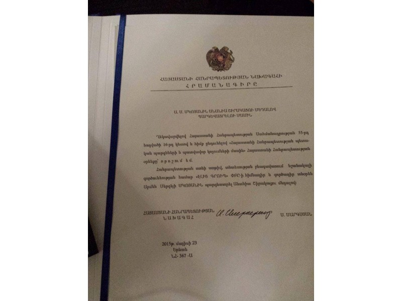 Հանրապետության տոնի առթիվ, տնտեսության բնագավառում նշանակալի գործունեության համար «Էլիտ Գրուպ» ՓԲԸ-ի հիմնադիր նախագահ Արմեն Մկոյանը պարգևատրվեց Անանիա Շիրակացու մեդալով: